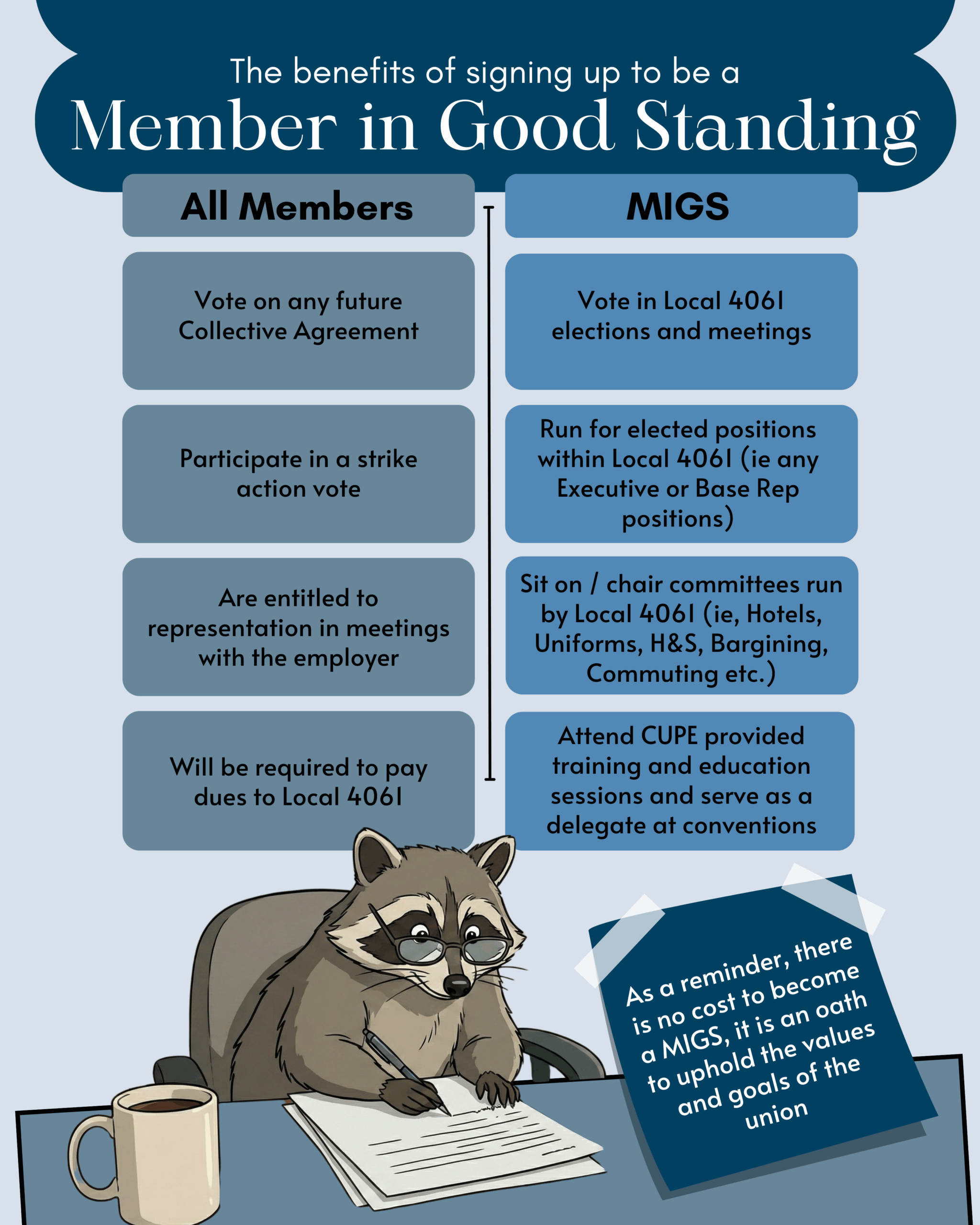 In order to get Local 4061 up and running, CUPE National provided our union with a Member in Good Standing signing exemption, that expires on Jan 31st 2026.